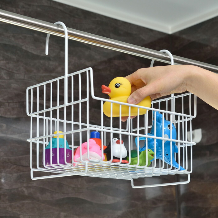 バーにかけられるタイプのバスケット収納です。中に入れたものが取り出しやすいように手前が大きく開口しているのが特徴です。底面には足がついており、直置きして使うこともできますよ。浴室はもちろん、浴室以外の場所にもかけられるので、水を切った後に風通しのいい場所で乾燥できるのがうれしいですね。