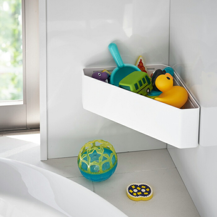 お風呂場のコーナーにマグネットで取り付けられるお風呂の収納です。ラックの下は網目になっており、自然と水切りできます。強力なマグネットでずれ落ちにくく、浴槽から浮かせることができるので掃除がしやすいのもポイントです。おもちゃを卒業したら、入浴剤やヘアブラシなどのバスグッズ置きとしても活用できます。