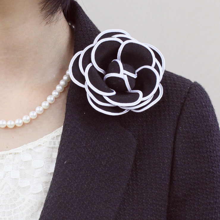 コサージュづくりのプロ、鎌倉工芸が手掛ける日本製のカメリアコサージュです。リボンなどに使用されるグログラン生地を使用し、さりげないおしゃれを演出しています。落ち着いたカラーでありながら華やかさを演出する人気のデザインです。