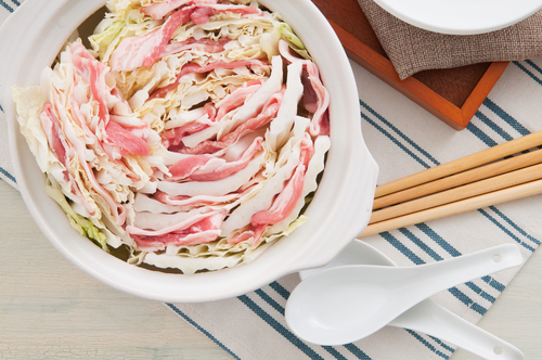白菜と豚バラを交互にはさみ煮立たせることで、お互いのうま味を凝縮できます。白菜の代わりにキャベツを使用しても良いですね。お好みで、万能ねぎと白ごまをかけてひと煮立ちさせると、さらにコクが出ますよ。