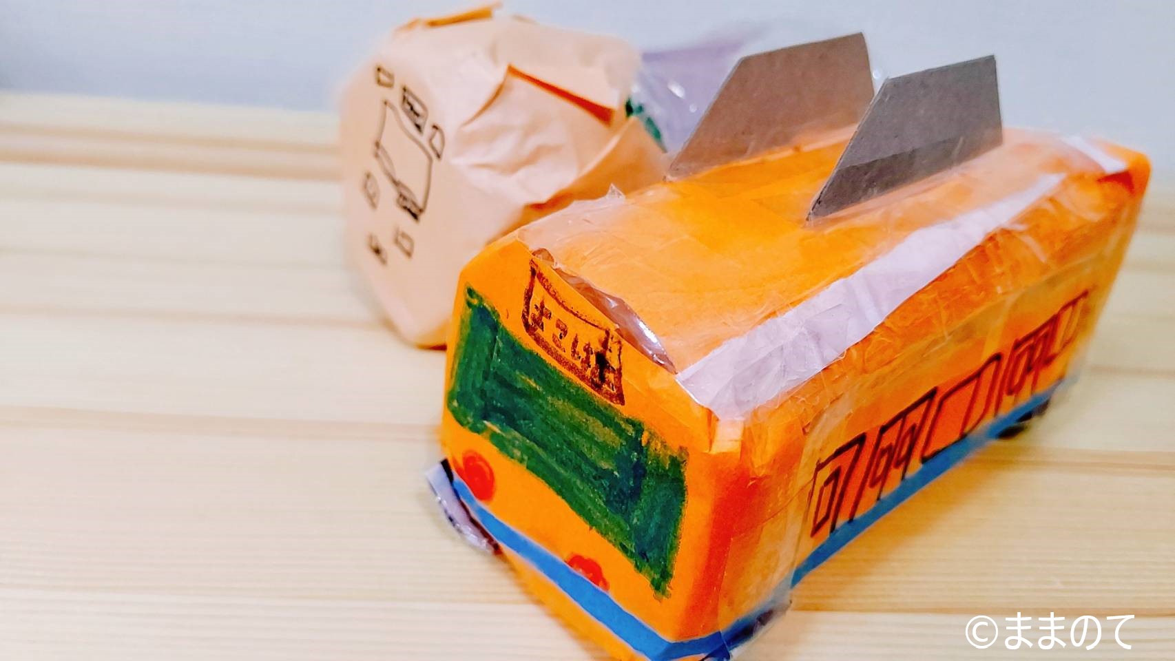 ペッドボトルにビニールテープを施したおもちゃです。少し難しそうに見えますが、窓やライトなど、一つひとつのパーツは単純なので、写真などを参考にすれば新幹線そっくりに作れるでしょう。