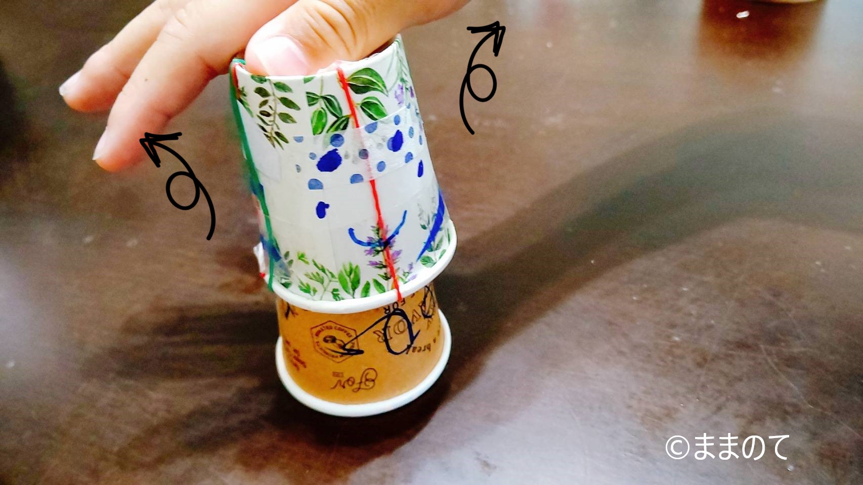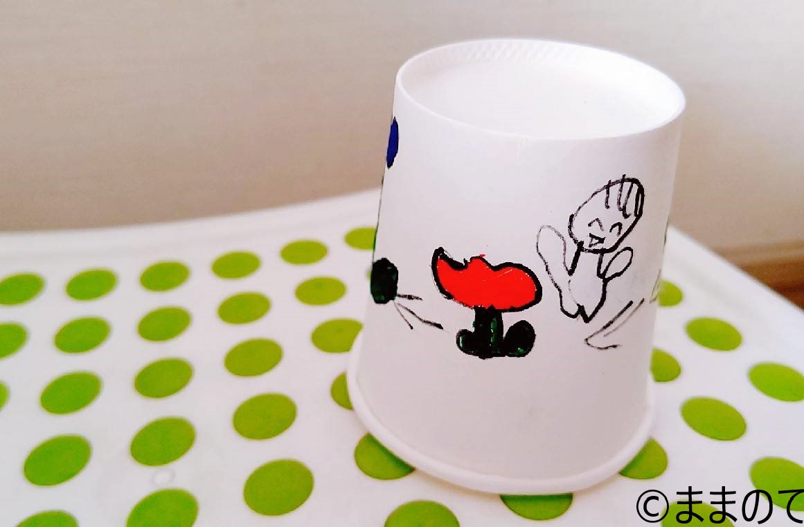 3.輪ゴムをつけた紙コップにペンで好きな絵を描く