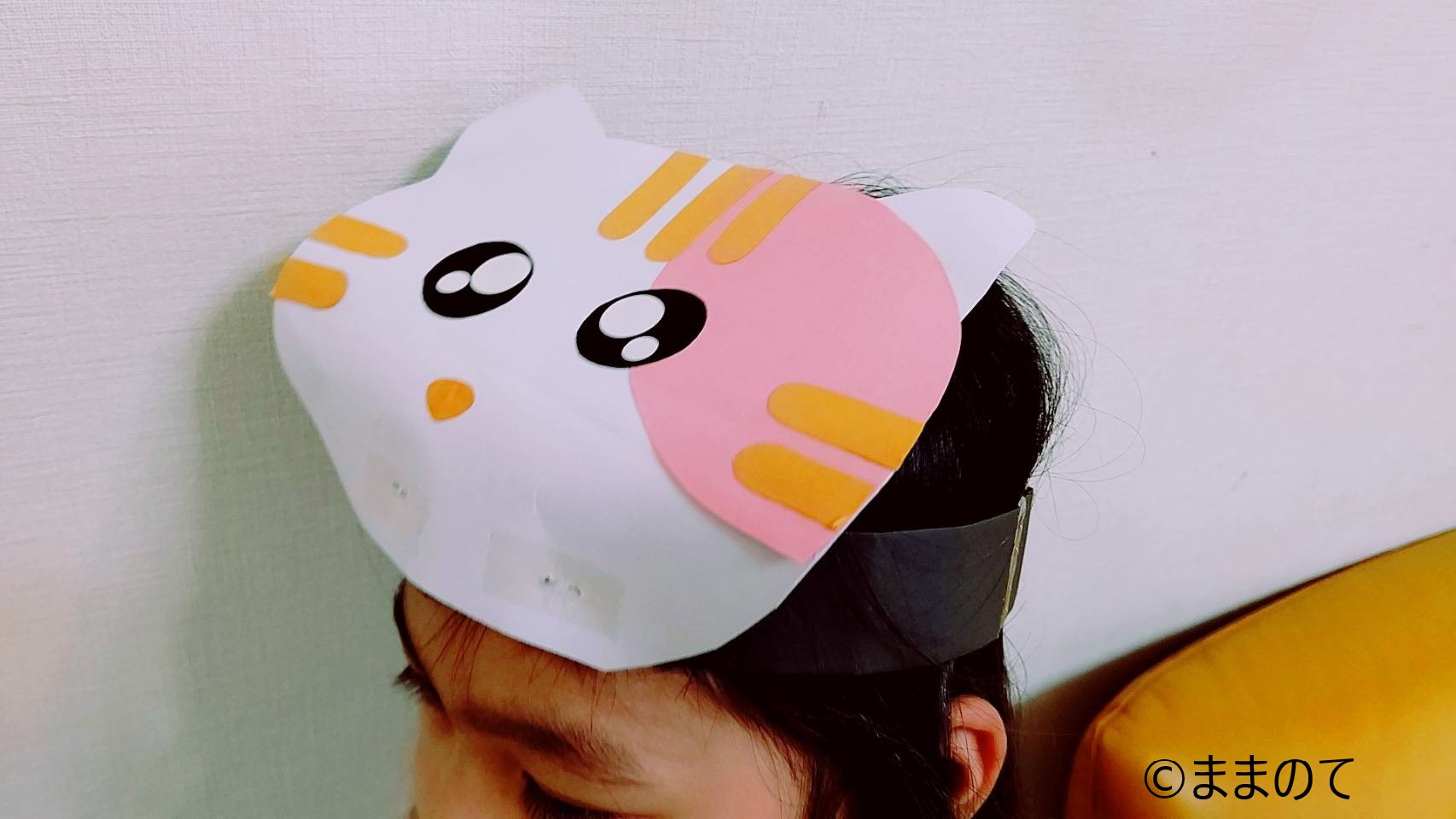 段ボール箱を使って、子どものお面を作ることができますよ。お面の帯は頭のサイズより少し小さめにわっかを作り、後ろは輪ゴムなどを付けて頭囲を調節すると良いでしょう。