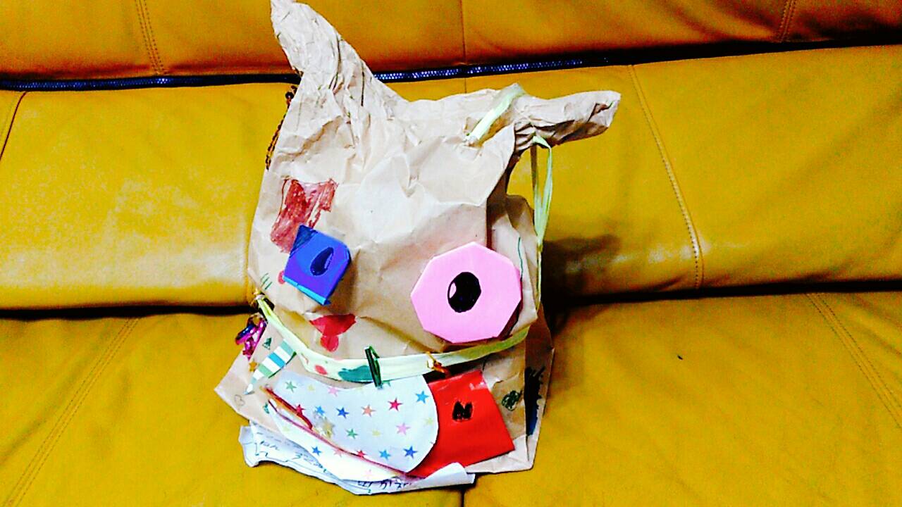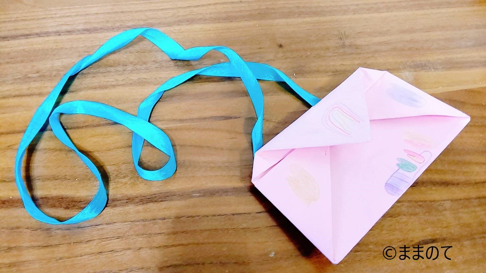 2.仕上がったカバンの両端にセロハンテープで紐を付けて完成