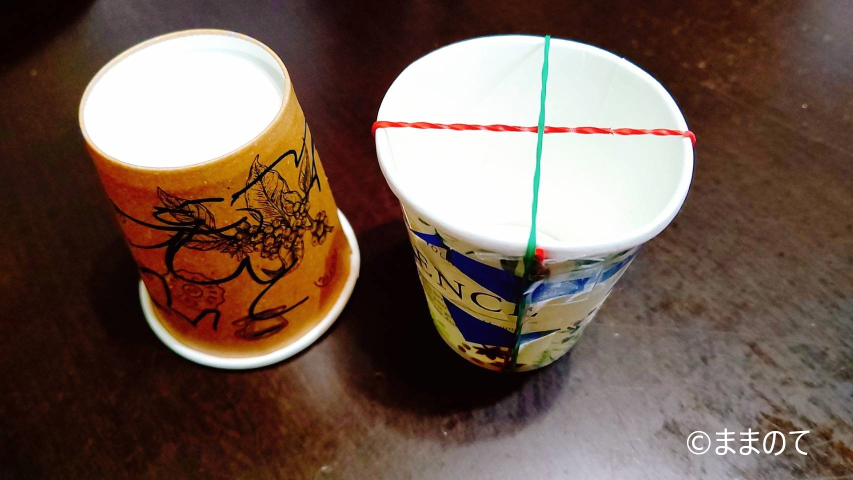 底に穴を開けて凧糸を通すだけで完成する、カエルの鳴き声がするようなおもちゃです。コップには鳥やカエルなど、鳴き声のする動物の絵を描いてください。濡れた布やウェットティッシュで凧糸をこすると、動物の鳴き声が聞こえます。