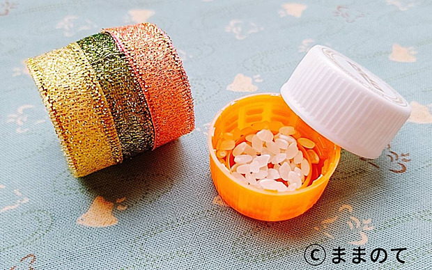 1.ペットボトルのキャップの片方に米や小豆などを入れる