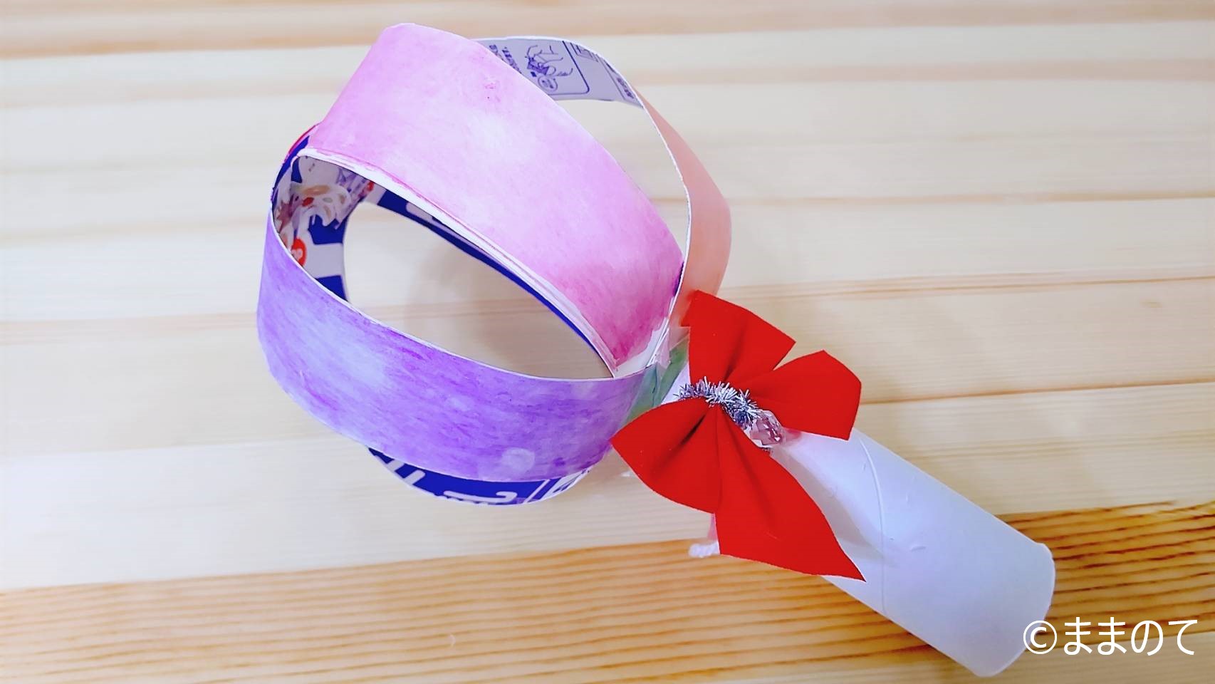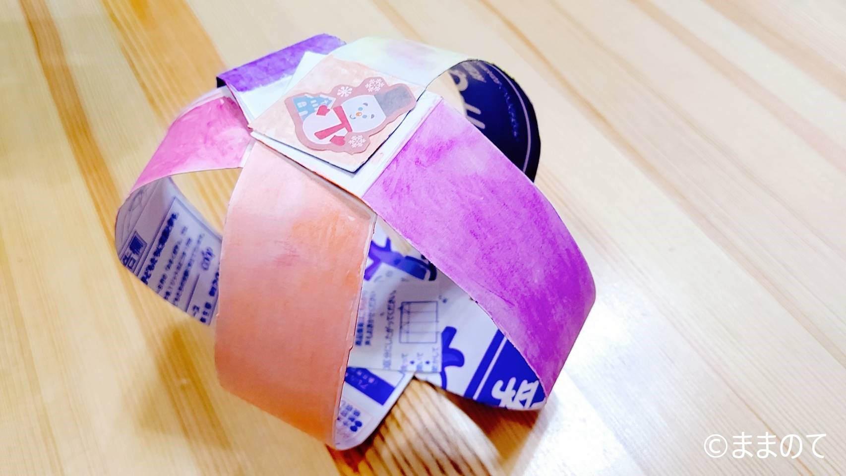 牛乳パックを同じサイズに切り、重ねて丸めます。隙間を詰めてビー玉を入れても良いでしょう。シンプルではあるものの、転がすと動きがおもしろいですよ。