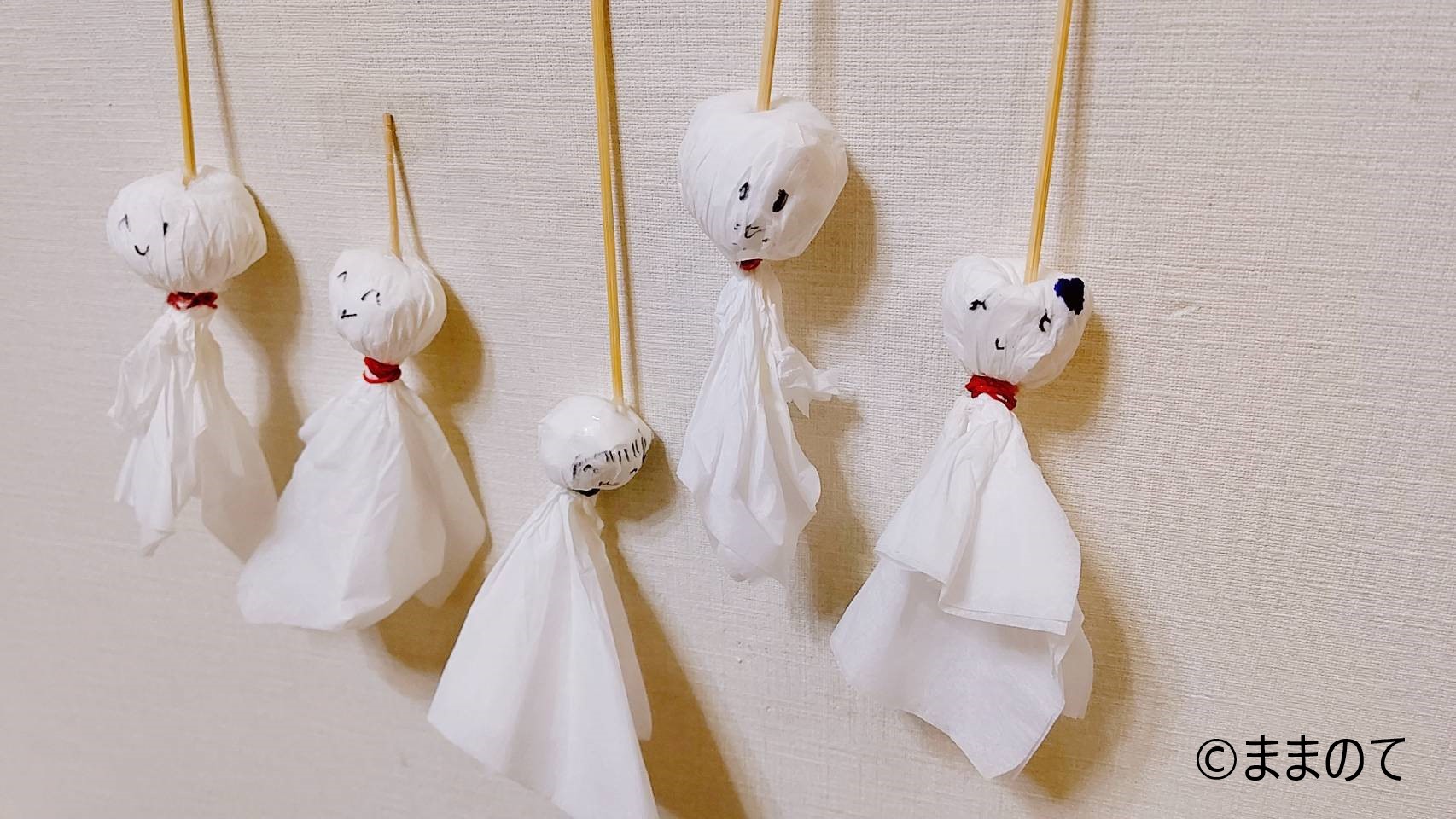 ティッシュペーパーを丸めるだけで、かわいらしいてるてる坊主を作ることができます。子どもの想像力をいかして、自由に顔を描いてみてくださいね。