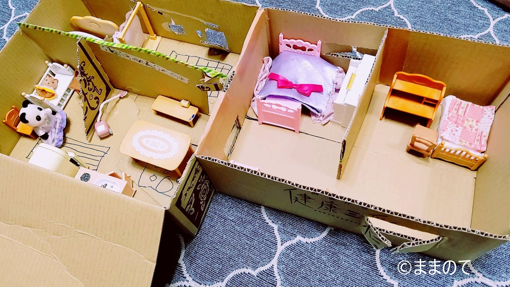 段ボール箱を使って、人形ハウスを作ることができます。カッターなどを使う場合は、必ず大人が使って製作しましょう。