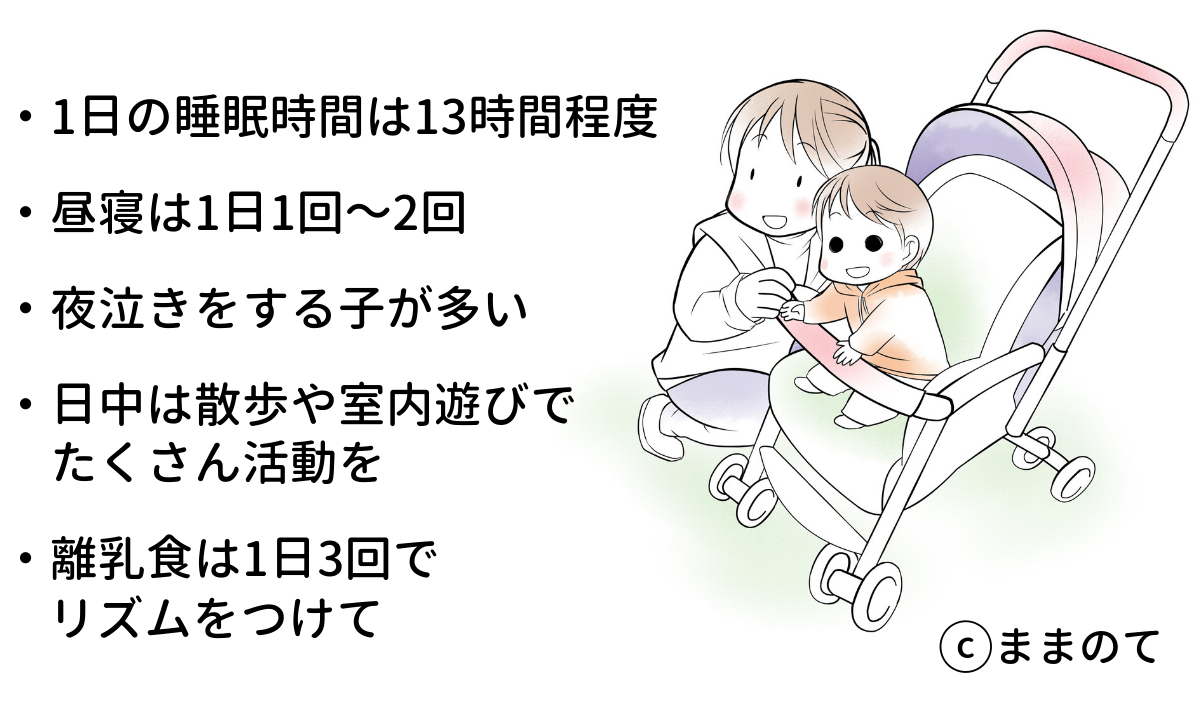生後9ヶ月頃の赤ちゃんに必要な睡眠時間は、12~15時間(※3)とされています。新生児のときに比べて起きている時間は増えましたが、1日の半分以上は寝ていることになります。日中1~2回のお昼寝をする赤ちゃんも多くいますよ。