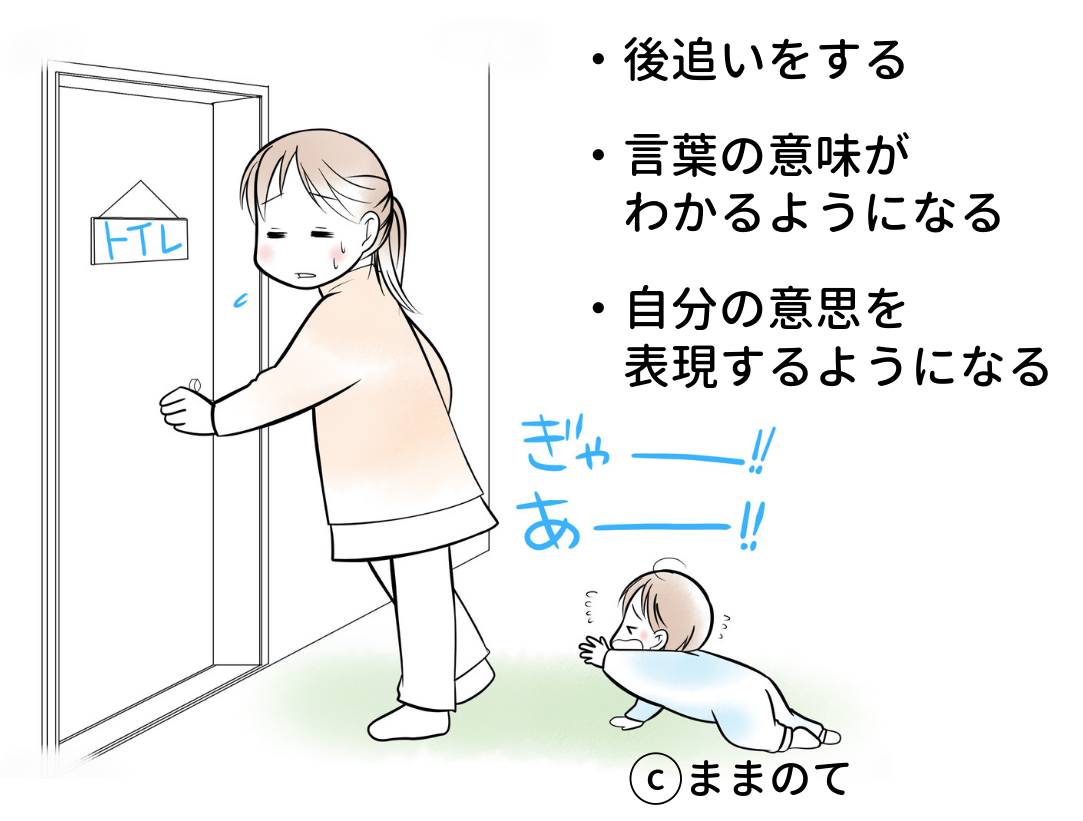 ハイハイができるようになった生後9ヶ月頃は、ママが目の前からいなくなると、自分でママを探して追いかけるようになる赤ちゃんが多いものです。家事はもちろんトイレにも入れずに困ってしまうママも多いでしょうが、後追いは赤ちゃんの成長の一環です。赤ちゃんのそばを離れるときには声をかけたり、抱っこやおんぶを活用したりして、上手に後追いの時期を乗り切ってくださいね。