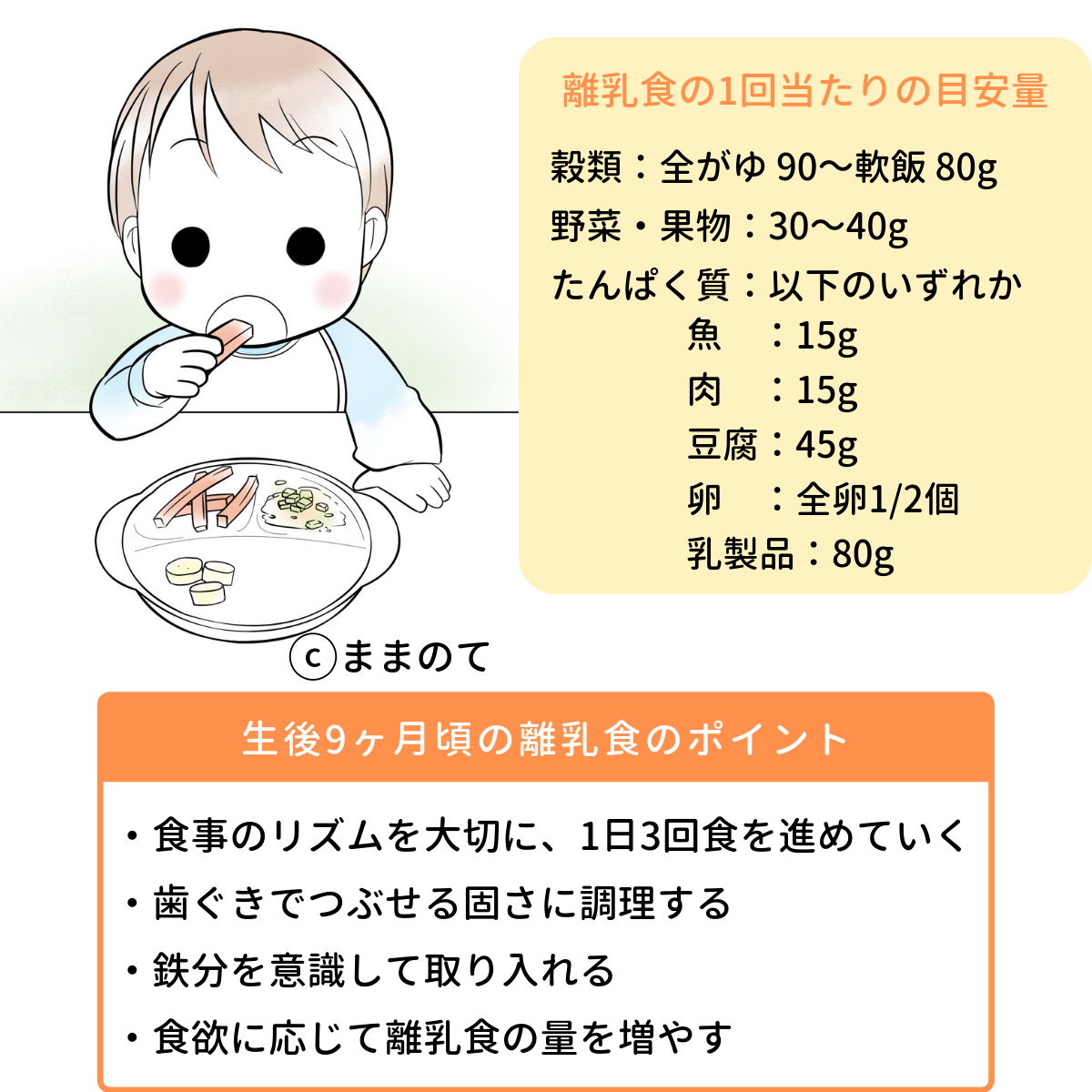 生後9ヶ月頃は離乳食の後期(カミカミ期)に入り、1日3回食にステップアップする時期です。1回の食事量の目安は上記イラストの通りですが(※2)、個人差があるので赤ちゃんのペースに合わせて進めても大丈夫ですよ。食材の固さは歯ぐきでつぶせるくらいを目安にし、やわらかく調理しましょう。
