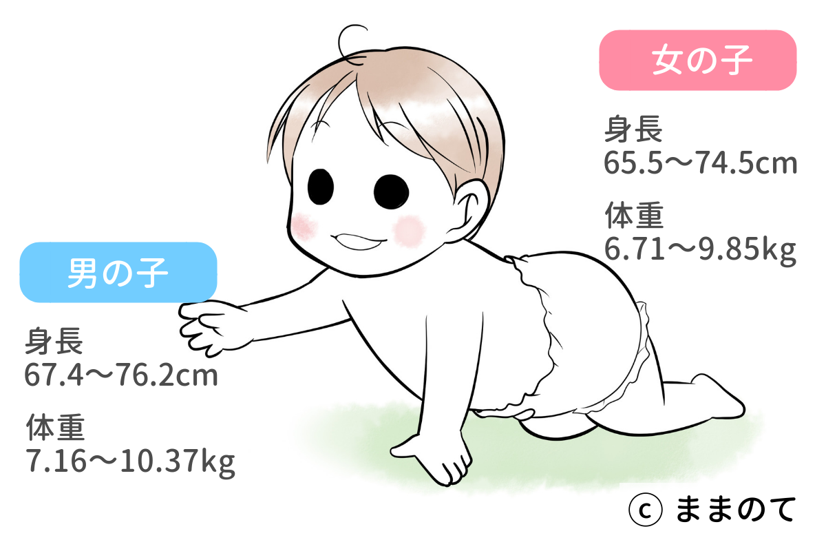 生後9ヶ月の赤ちゃんの身長・体重の目安は以下のイラストの通りです(※1)。ハイハイやつかまり立ちをするなど動きが活発になるため、一時的に体重が増えない赤ちゃんもいますが、元気な様子であれば特に心配はいらないですよ。