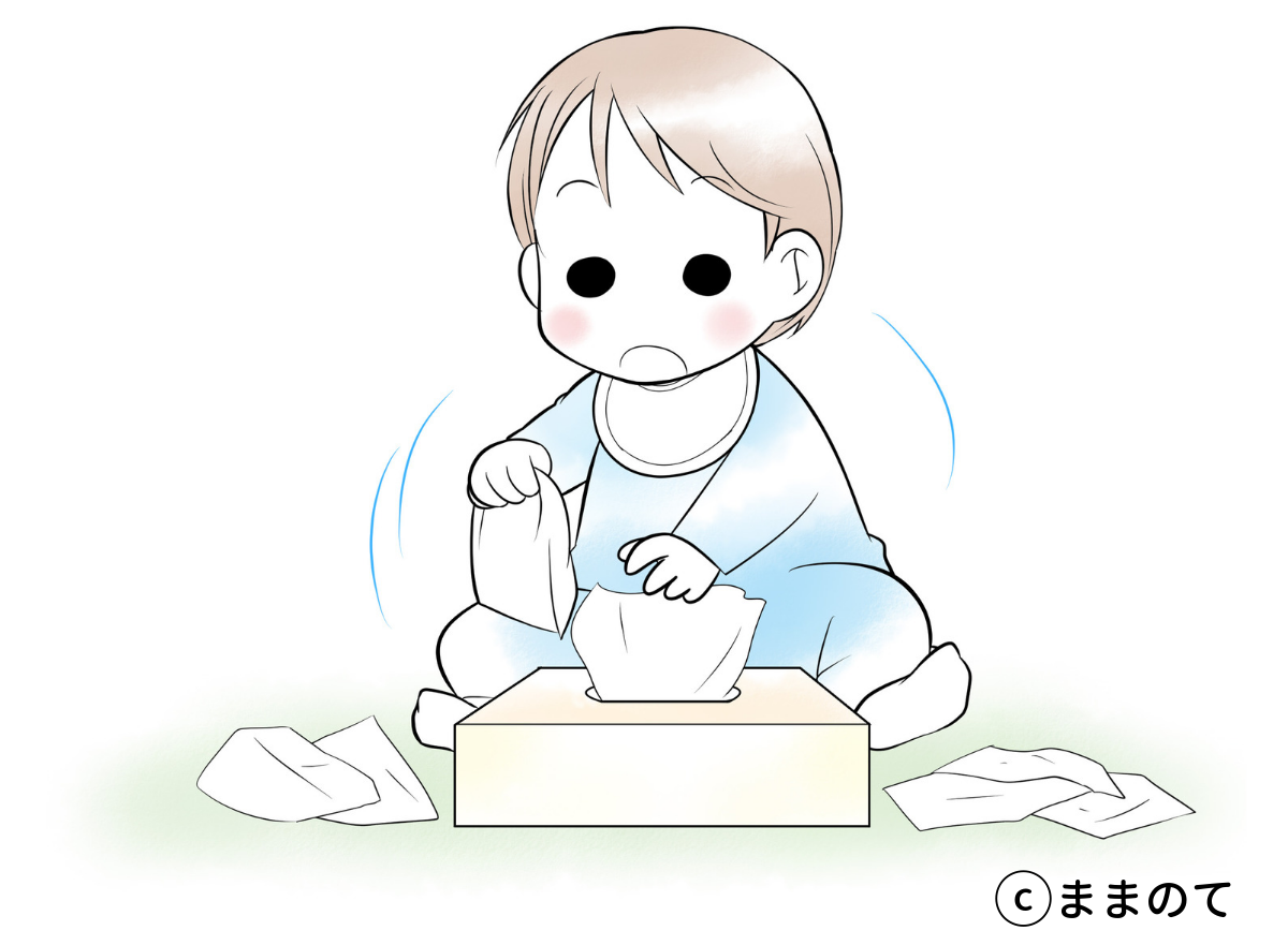 生後9ヶ月頃の赤ちゃんは手先が器用になり、手で持って調べて遊ぶようになります。次々と出てくるティッシュに夢中になったり、積み木を繰り返し崩して遊んだりする様子がよく見られます。