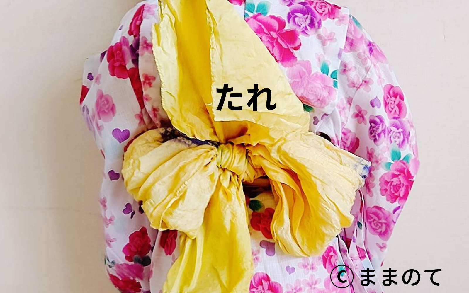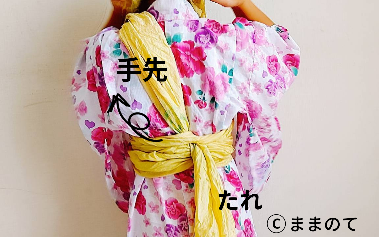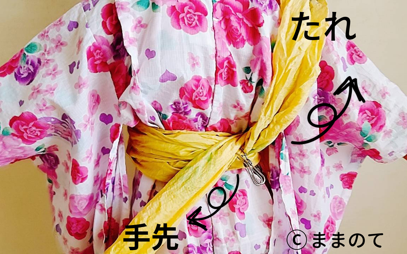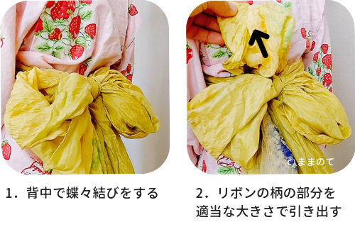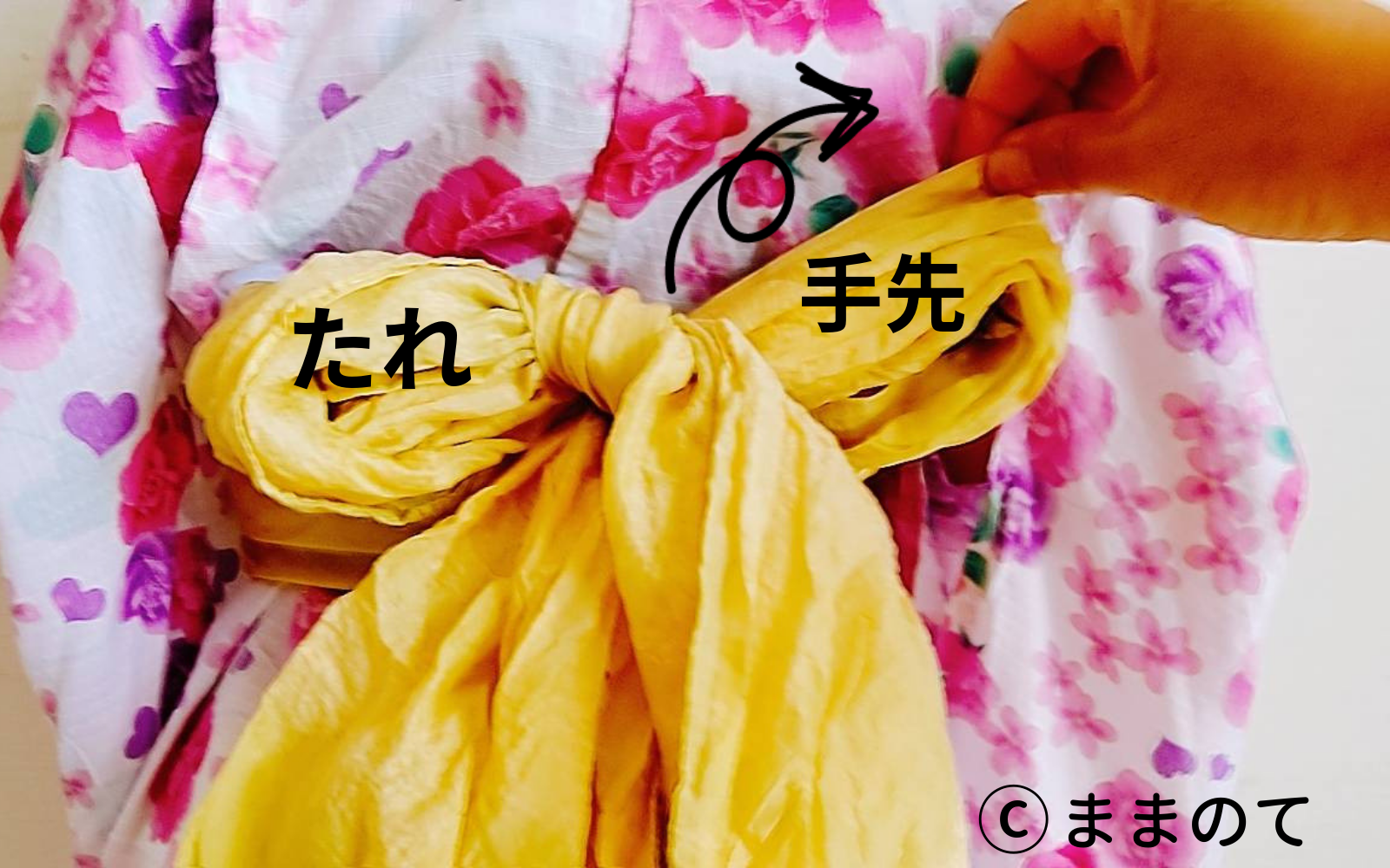 ただし、普通にリボン結びをするだけでは緩くなってしまったり、ほどけてしまったりするかもしれません。リボン結びをするときに腰に巻いた帯にくぐらせてから結ぶと、ほどけにくくなりますよ。