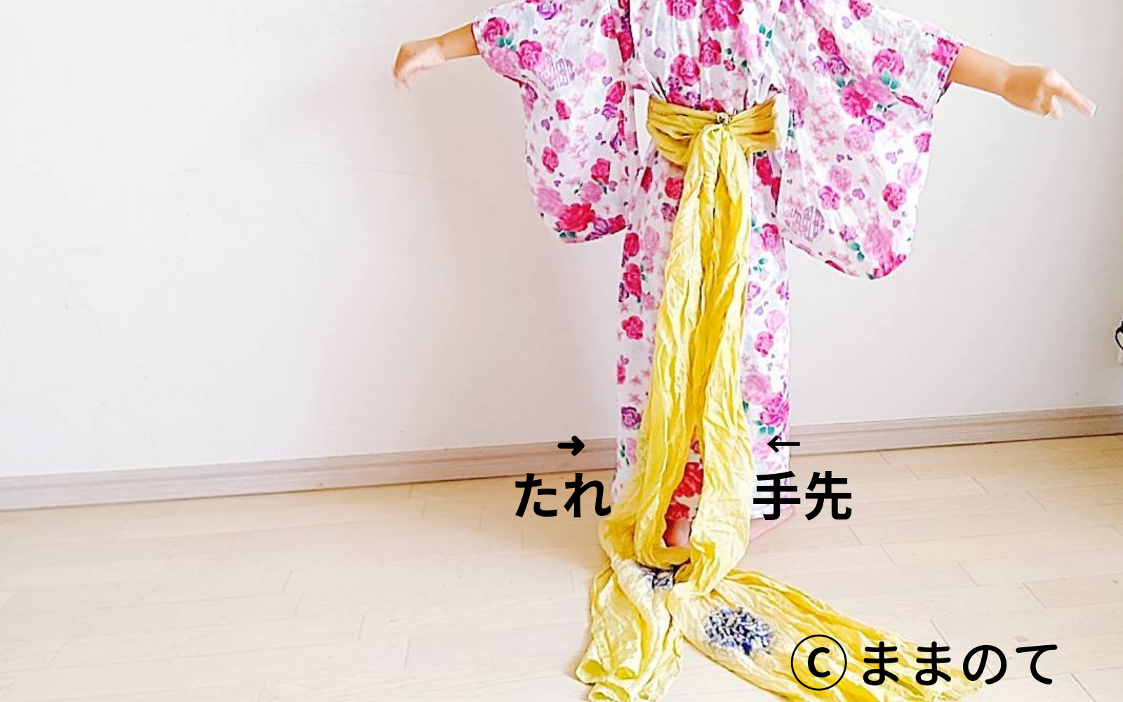帯をまわして、手先がたれより約15cm長くなるよう調節します。結んだ後に長さが合わなければまた長さを調節しましょう。