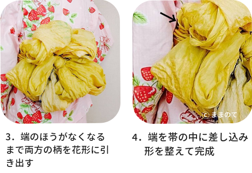 3.柄の部分(端まで)をすべて花形に帯を引き出す