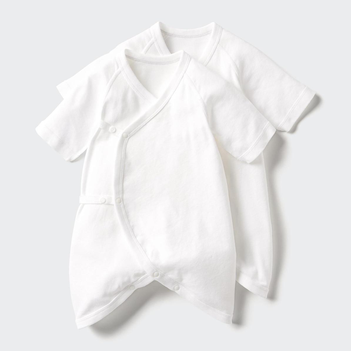 コンビ肌着は短肌着よりも裾が少し長くなっていて、股下にスナップボタンがついています。赤ちゃんが足をバタバタ動かしてもめくれにくく便利ですよ。夏は単品で重宝しますし、冬は短肌着と組み合わせることもできます。ユニクロのコンビ肌着は伸縮性のある「フライス編み」で、洗濯をしても形が変化しにくい編み方になっています。