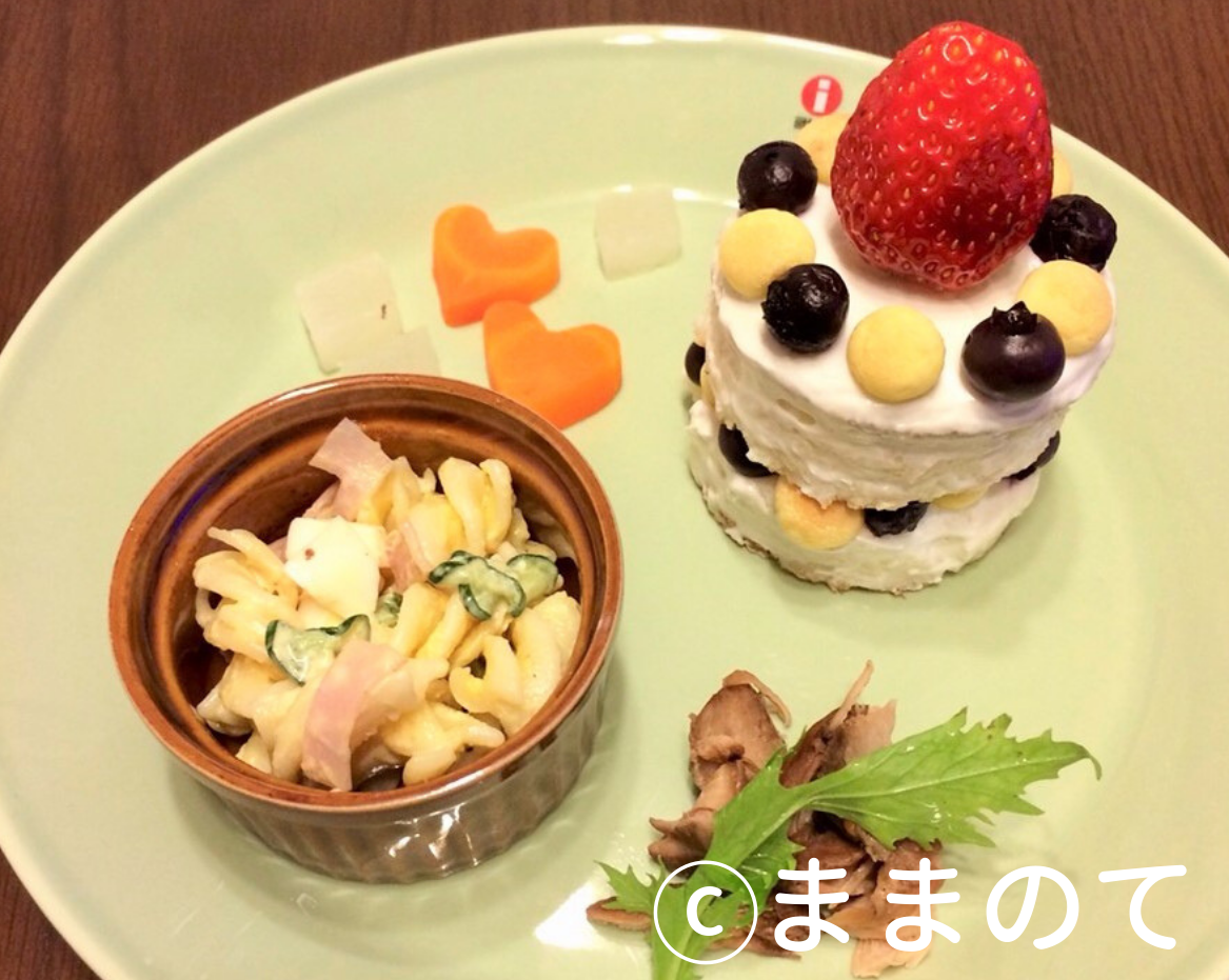 ミニケーキは丸いクッキー型で型抜きした食パンを重ね、水切りヨーグルトと大好きな卵ボーロ、ブルーベリー、いちごでトッピング。とても喜んでくれました。
