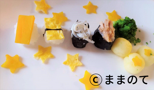息子の1歳のお誕生日には、ミニお寿司のバースデープレートを用意しました。お寿司の具は左から順に、にんじん、薄焼き玉子、しらす、ツナです。ブロッコリーとマッシュポテト、型抜きした薄焼き卵とにんじんで周りを飾りました。