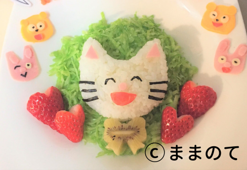ノンタンの背景にはだしで味付けしたゆでキャベツ、リボンにはキウイ、ハートにはいちごを使っています。細かい作業が多く、作るのに苦労しましたが、娘がとても喜んでくれていたので、頑張って良かったなと思いました。