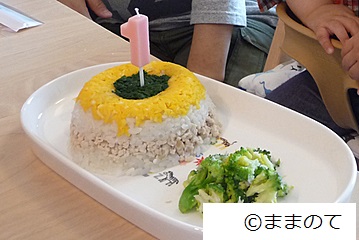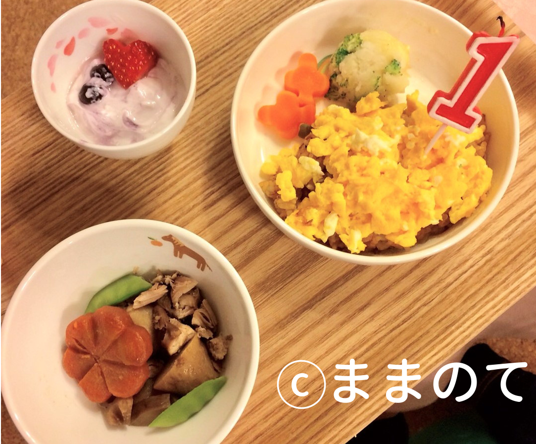 1歳の誕生日は親族を招いてパーティーをしました。子どものメニューは混ぜご飯に卵のせたオムライス風ごはんをメインにしました。炒り卵を使ったので、食べやすそうでしたよ。付け合わせには、ゆでたにんじん、マッシュポテトにブロッコリーを混ぜたものを用意しました。