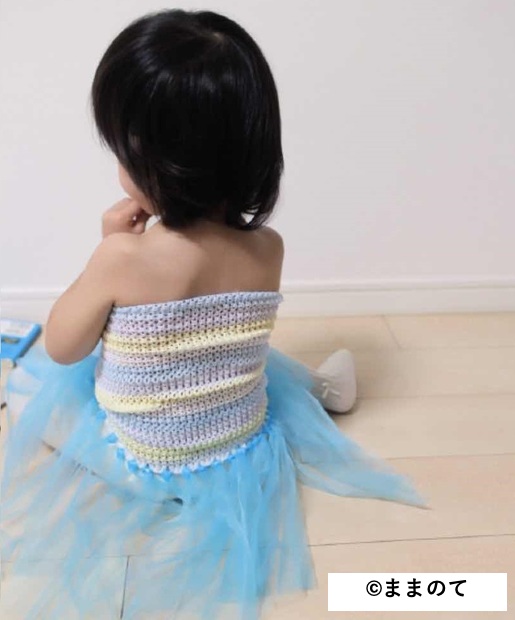 ベアトップになるので、ゴムを使ったチュチュとはまた違ったイメージ。肩ひもなどをつければ、かわいいドレスのできあがりです。
