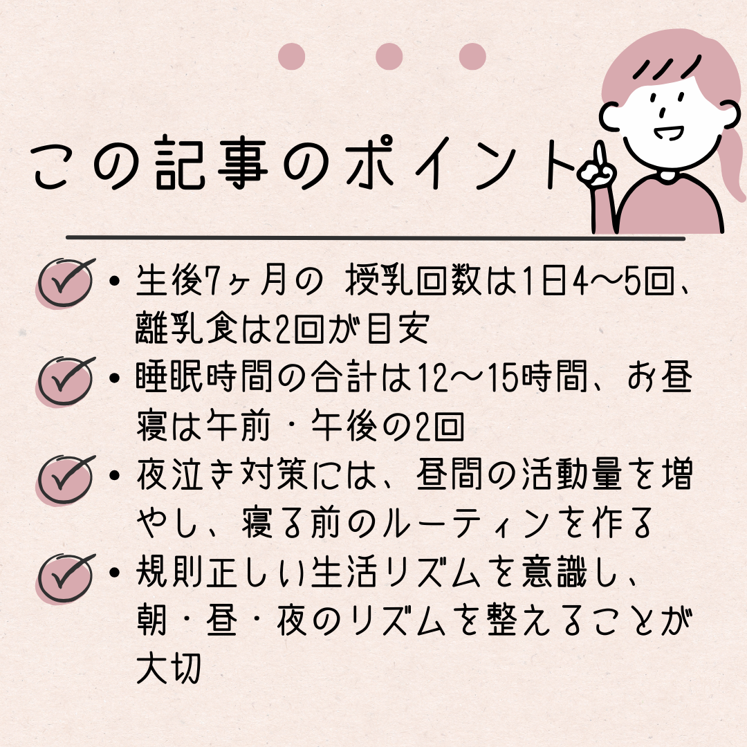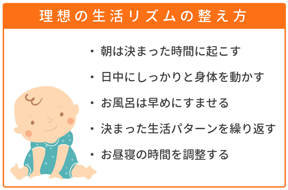 生後7ヶ月頃の赤ちゃんの生活リズムを整えるには、1日の過ごし方をある程度決めておき、スケジュールに沿ってお世話をすることが大事です。規則正しい生活は赤ちゃんの健康や発達にも良い影響を与えます。