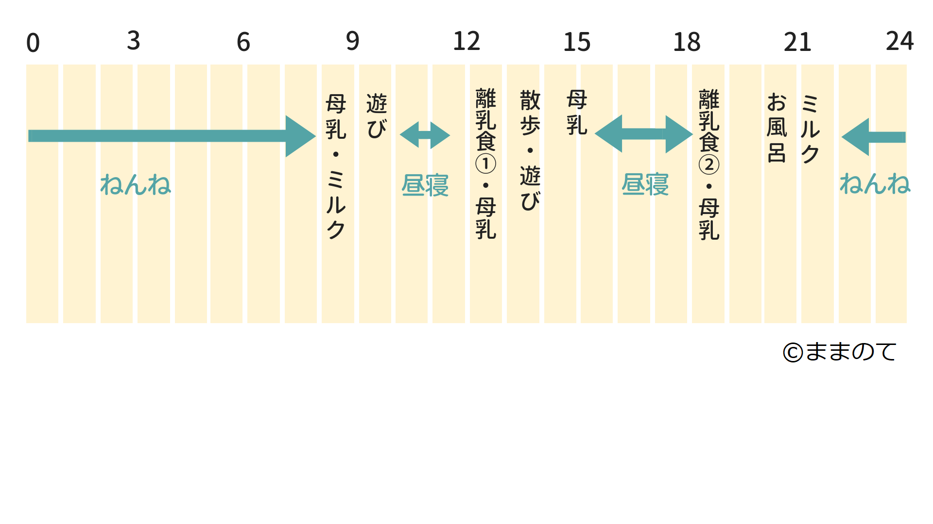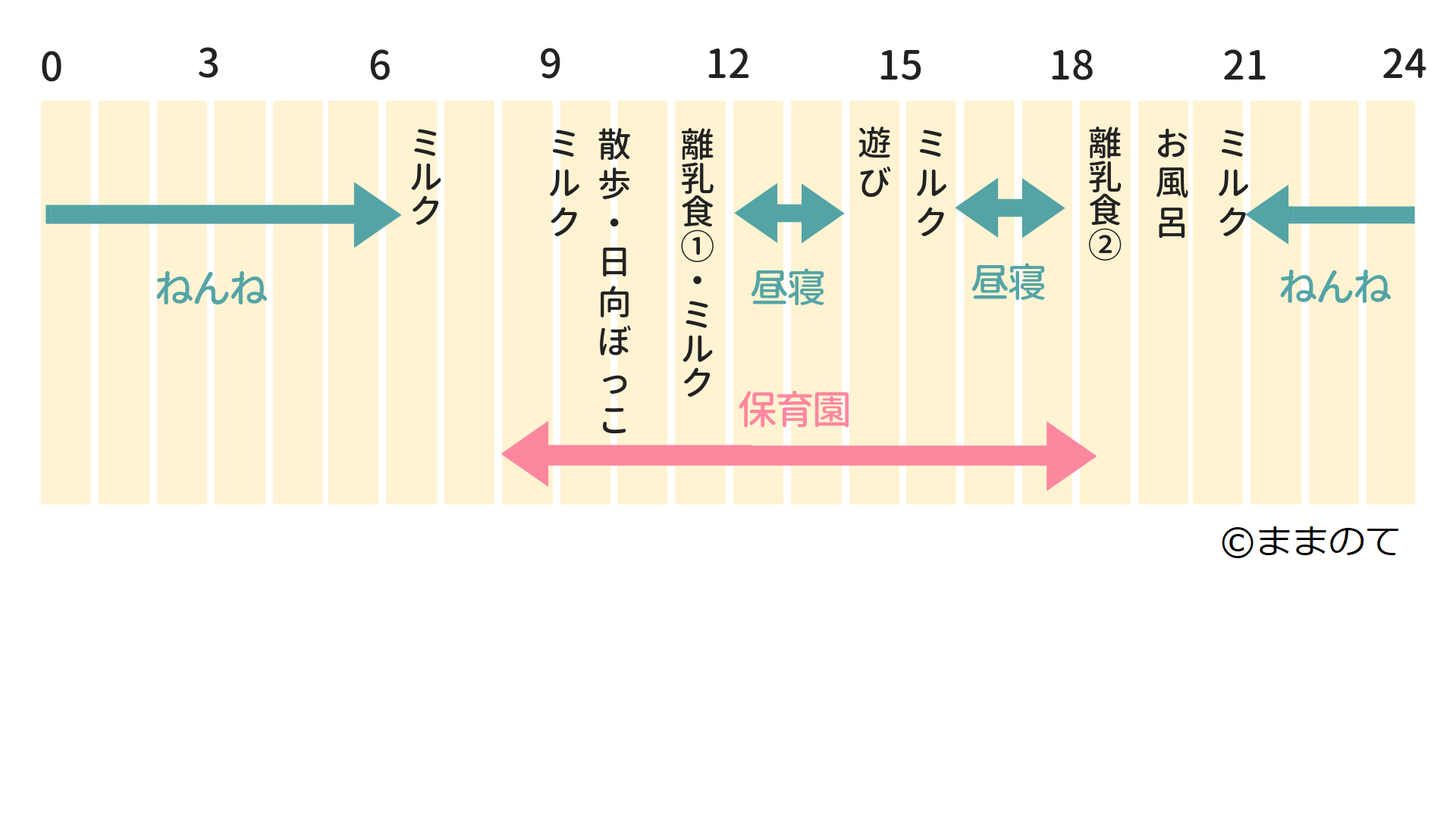 生後7ヶ月頃になると、保育園に通い始める赤ちゃんも多いですよね。保育園ではミルク・離乳食・お昼寝の時間が決まっているので、生活リズムが整いやすくなります。