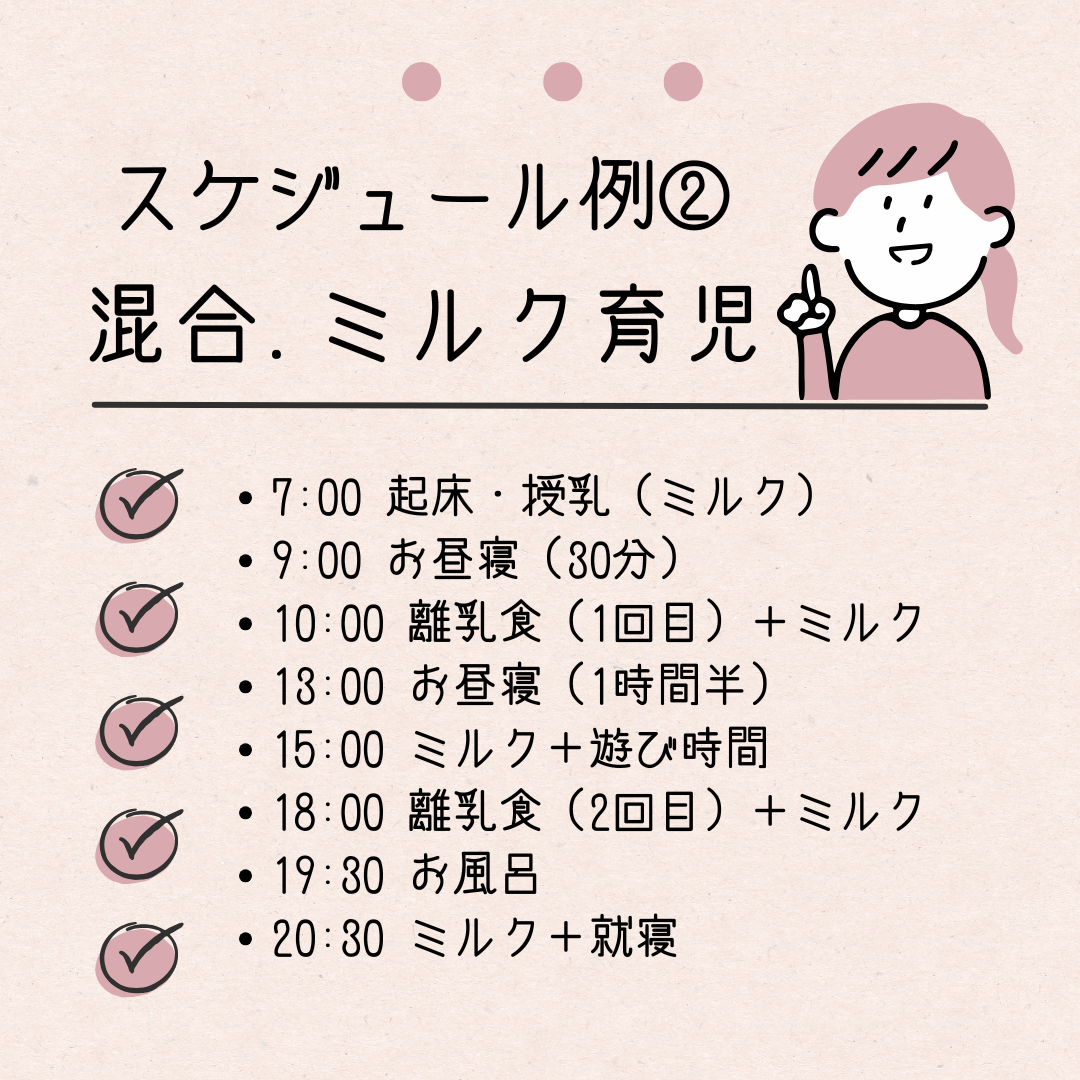 混合栄養育児、完全ミルク育児の授乳回数は、2回の離乳食後+3回前後が目安です。離乳食後の授乳は赤ちゃんが欲しがるだけ与えます。
