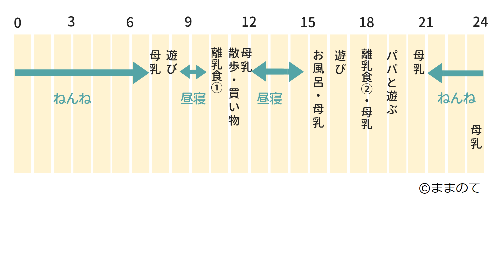 昼間は活発に行動するようにしました。昼寝の時間は、午前に1回、午後に1回と安定していたので、お昼寝に合わせて行動するようにしました。眠くなりそうな時間帯には、ぐずぐずしても問題ない場所にいるようにしたり、自宅にいるようにして工夫しました。