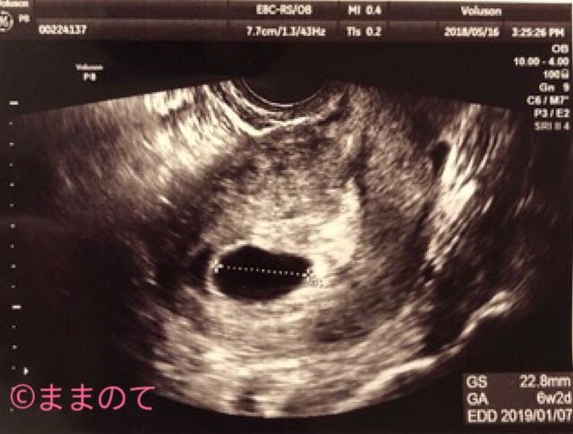 妊娠6週の健診では経腟の超音波検査が行われます。上のエコー画像は妊娠6週2日の子宮の断面を写したもので、真ん中の黒い丸は胎嚢です。