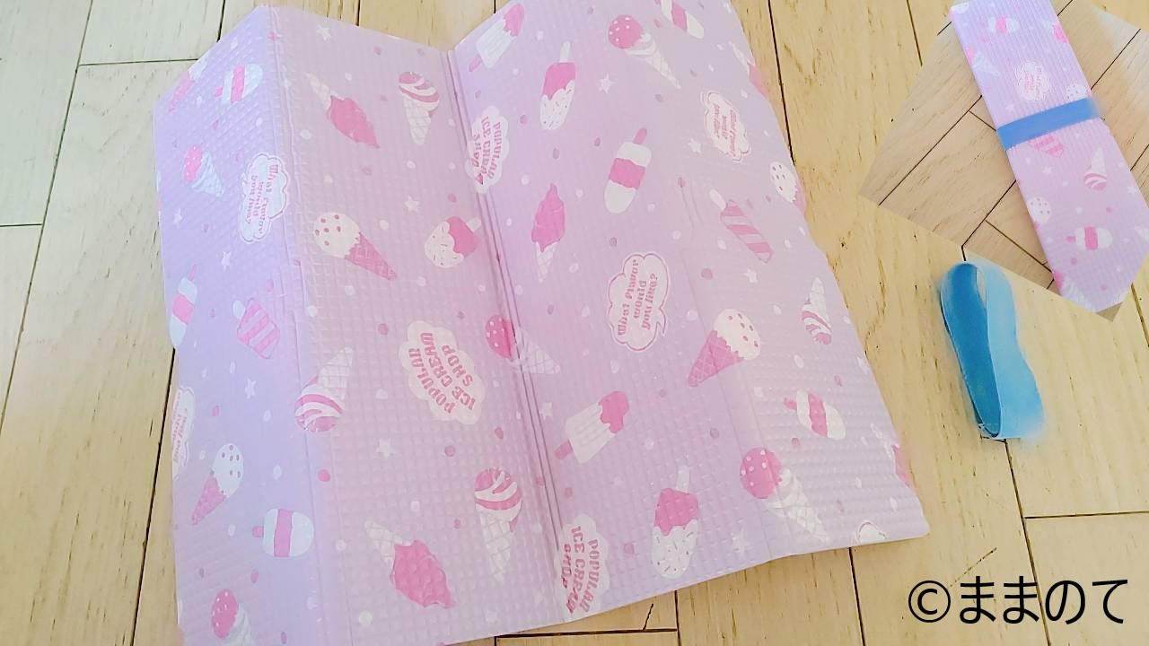 セリアには、コンパクトに折りたたむことができるレジャーシートもあります。おしゃれな柄が豊富で、100均のアイテムとは思えないものもありますよ。折りたたんだ後は付属の紐で固定して、鞄の中でのばらつきを防げます。