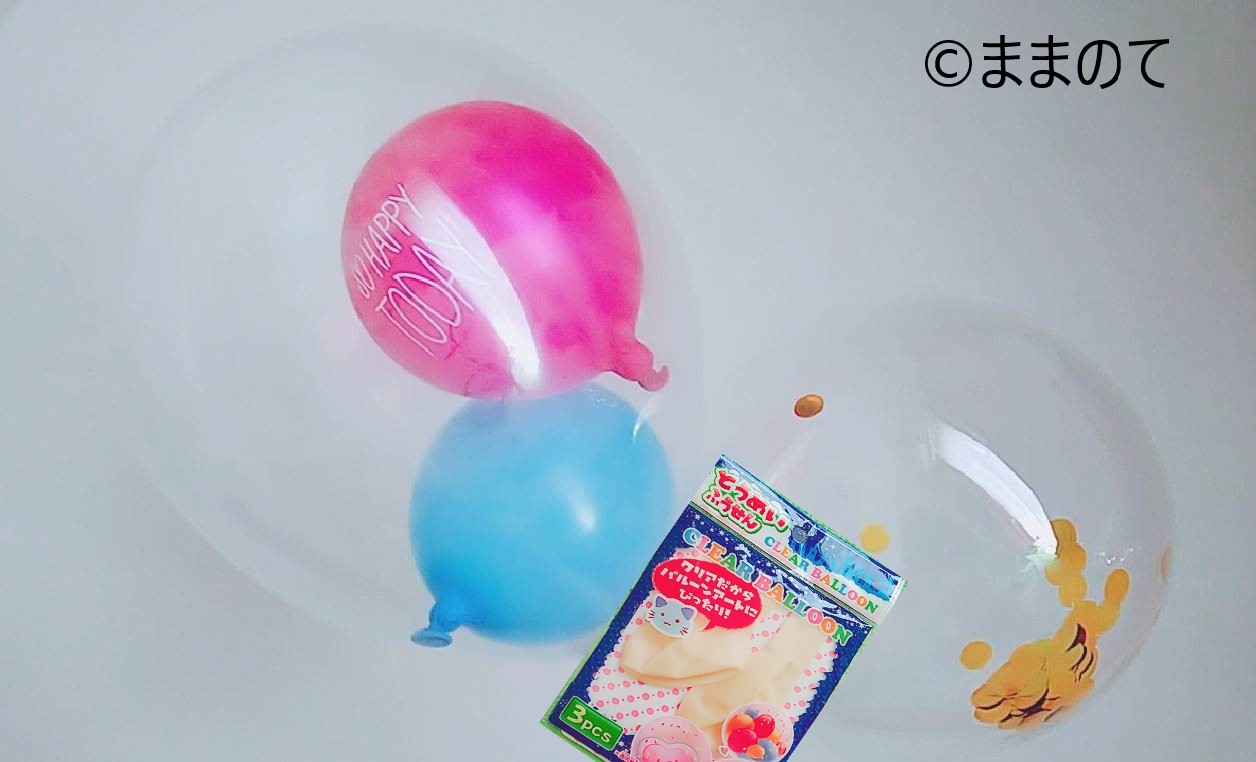 バルーンinバルーンとは、大きなバルーンの中に小さなバルーンを入れて飾るアイデアです。100均で購入できる透明バルーンの中に、少し小さめの風船を入れるときれいに仕上がるでしょう。画像は、30cmの透明風船の中に12cmの風船を入れたものです。