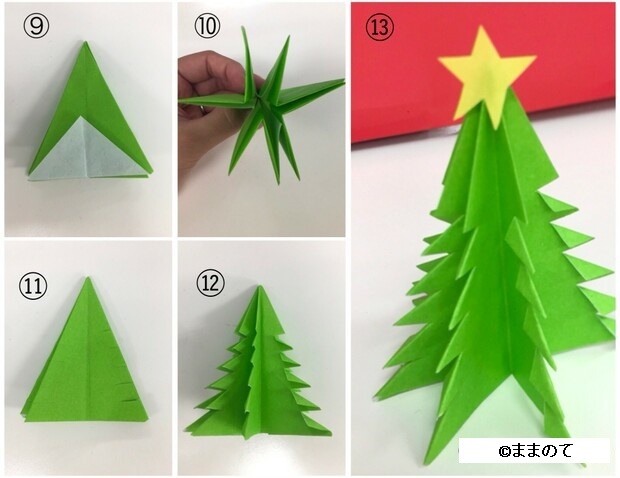 13.全体を広げ、星などを飾ると小さなクリスマスツリーの完成です。