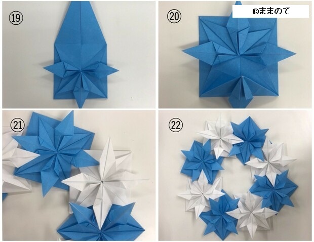 21.上下を反対にして15~19の手順で折ると、雪の結晶が完成します。雪の結晶が8つできたら、互いに重ね合わせてのりづけします。