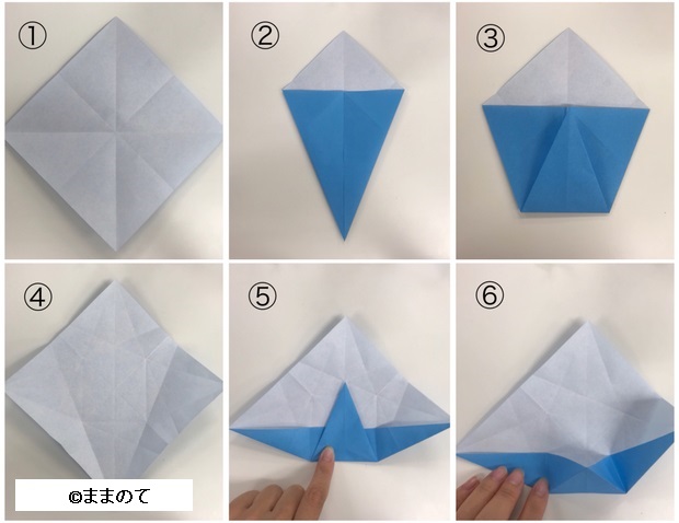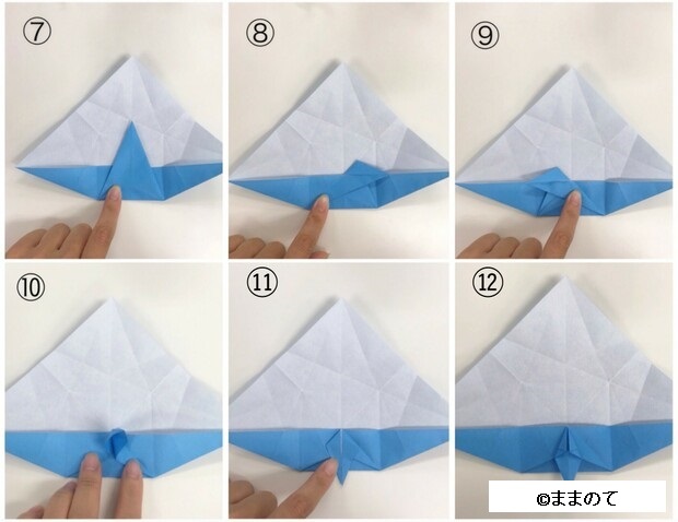 5~6.真ん中の線にそって左右を折ると、中心に三角形ができます。