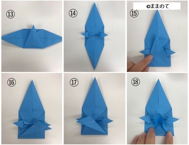 18.左右を折り、袋状に鳴る中心部分を開いて手前に折ります。