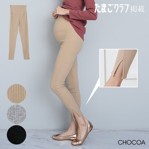 妊娠中でもおしゃれ心を忘れたくないママにぴったりなのが、流行のスリット入りレギンスです。細身のリブで、美脚に仕上げてくれますよ。