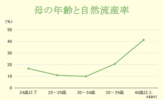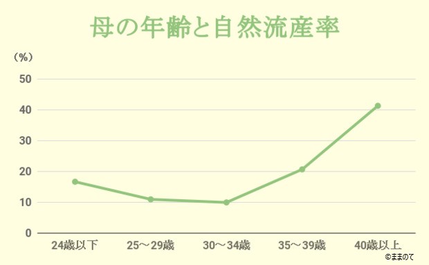 上のグラフは、厚生労働省が公表している自然流産に関するデータをもとに作成したものです(※4)。35歳~39歳の妊婦さんの流産率は20.7%、40歳以上では41.3%となり、25~34歳の妊婦さんと比べて流産率が大きく上昇していることがわかります。