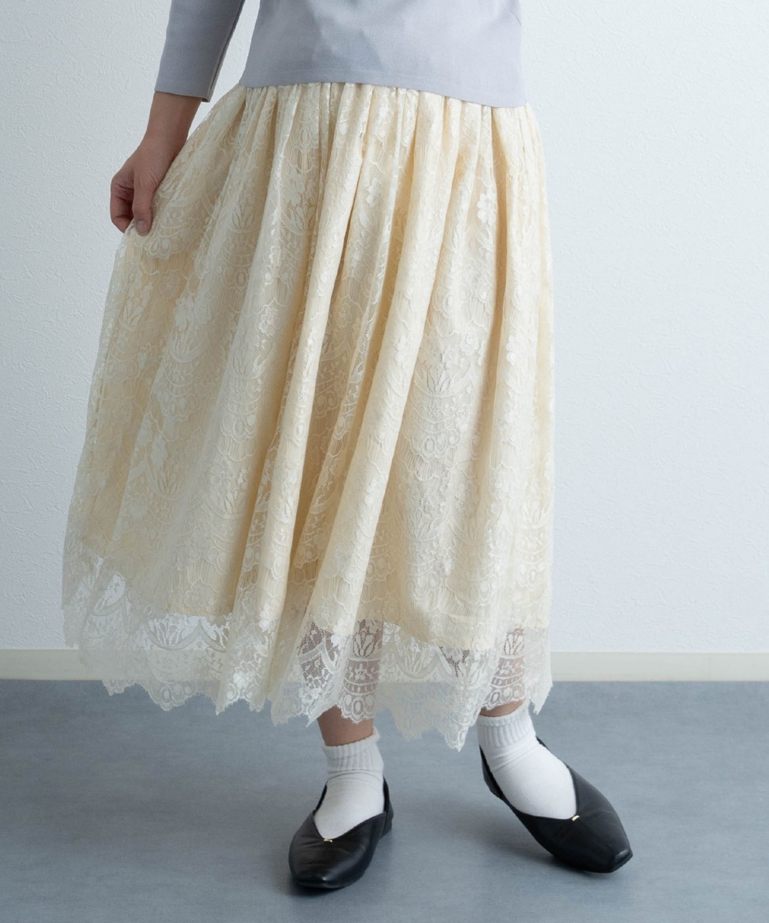 ちくちくしない総レースのスカートは、大人かわいいデザイン性が魅力。カジュアルにもきれい芽にも着こなせるシルエットで自在なコーデが楽しめます。ウエストにはリボンが付いているので、産後はリボンの長さを調節してすっきりと着られます。