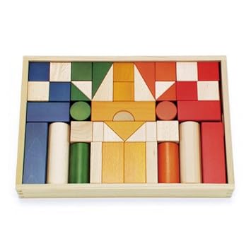 1歳半頃に娘が使っていた積み木は、手押し車の積み木です。お片付けのときは木箱にぴったり収納できるので、上手に入れられたときはほめるようにしていました。