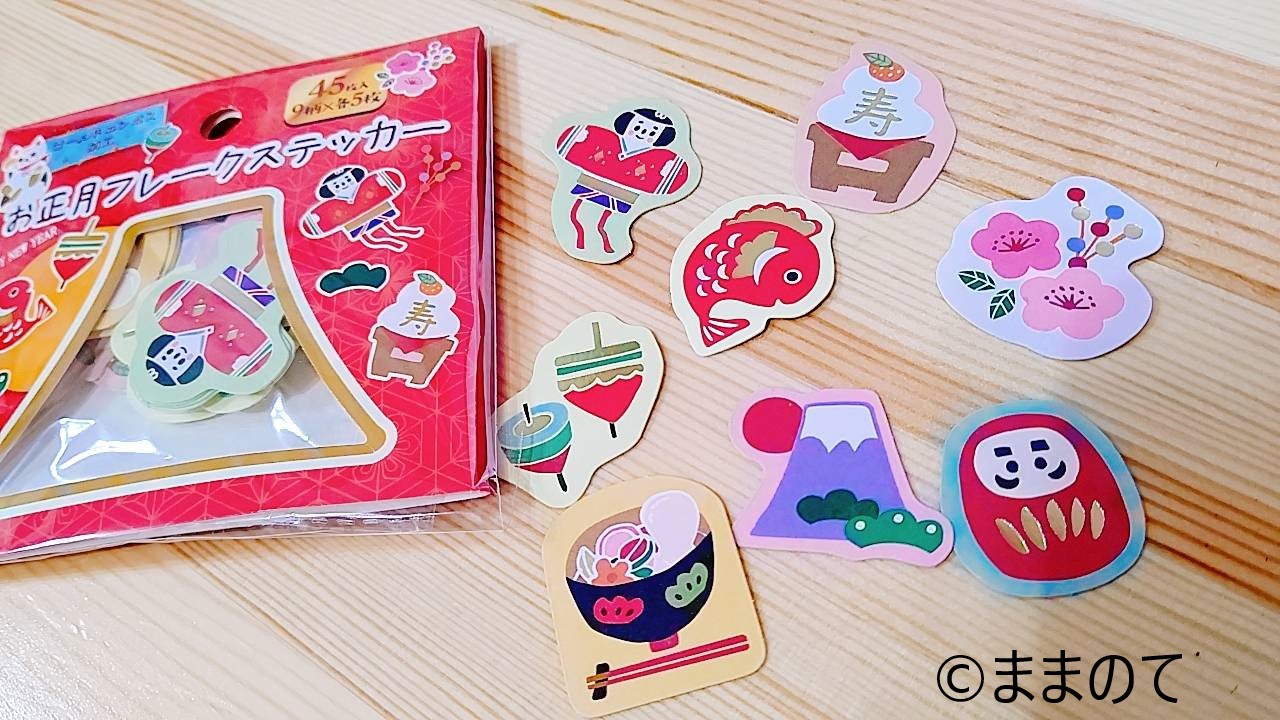 セリアでは、お正月にちなんだフレークシールが販売されています。富士山や鯛、だるまなど、縁起が良いとされるモチーフがたくさんありますよ。小さな子どもとシールを貼って遊んでも良いですね。