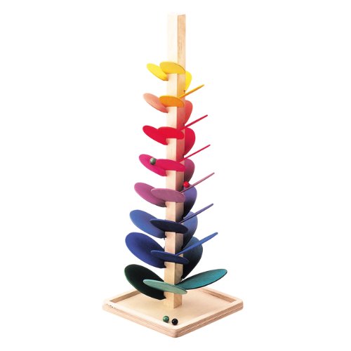 ビー玉が上から下に落ちるたびに、木琴のようなやさしい響きが聞こえる「カラコロツリー」は、 何度も繰り返しあそびたくなるおもちゃです。下までビー玉が落ちたとき、どこかに転がってしまわないよう、土台には枠が付いています。