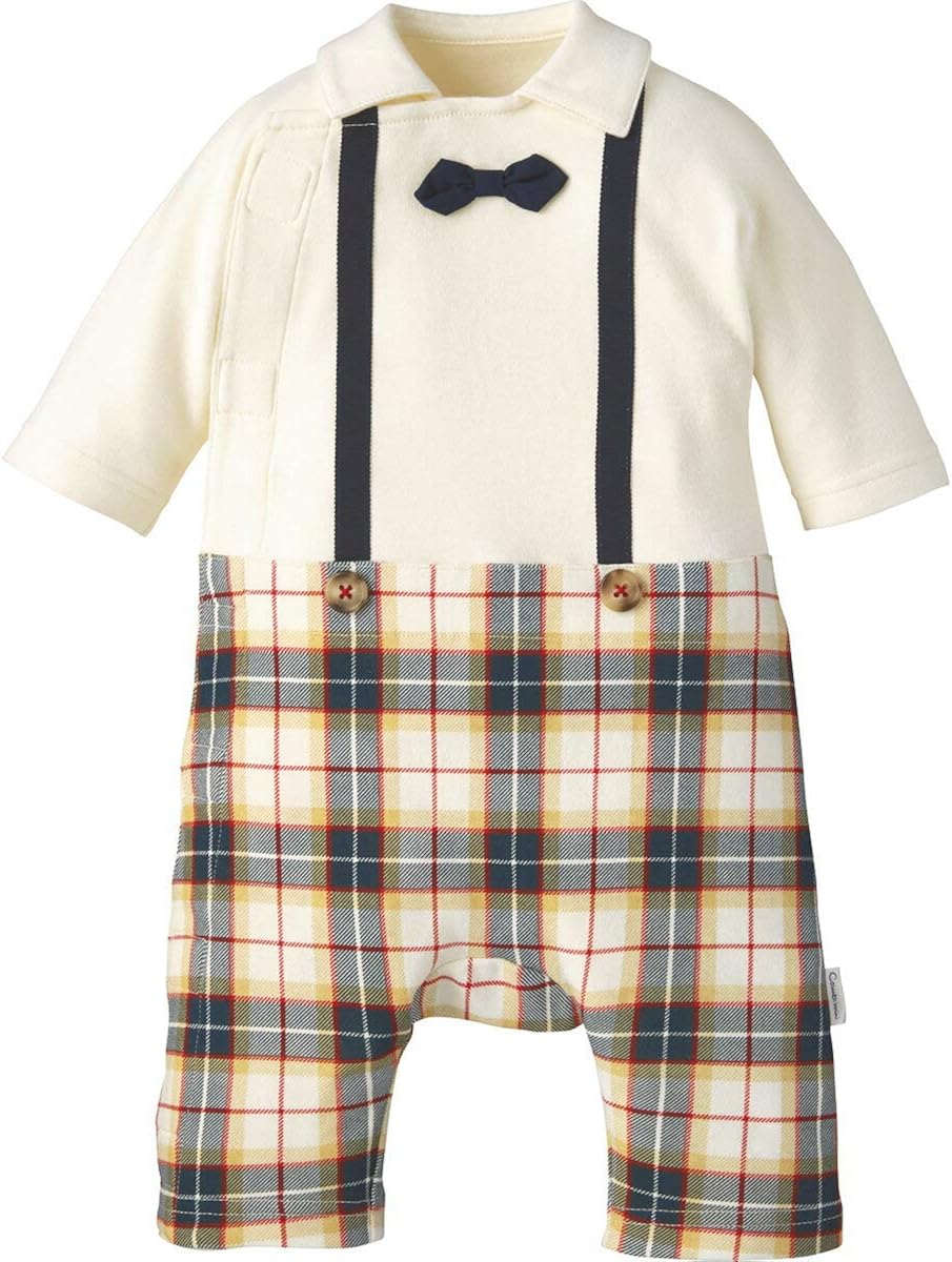 襟つきシャツに蝶ネクタイとチェックのサスペンダーパンツをあわせたトラッドな装いができます。綿100%のスムース生地で、3シーズン着用できるのも魅力です。赤ちゃんを連れて挨拶するときなど、おでかけのときに着せたくなるドレッシーなデザインになっています。