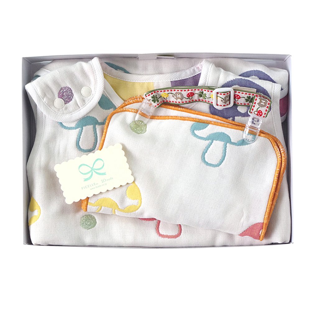 1年中使えるガーゼスリーパーとクリップ&3枚のハンカチがセットになっています。スリーパーは新生児から3歳頃まで使うことができます。