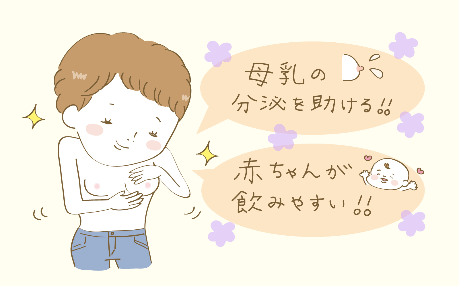 母乳マッサージは、ママの血流を良くすることで、母乳の分泌を良くする働きが期待できます。また妊娠中に乳首と乳輪のマッサージを行なっておくと、授乳がスムーズにすすむケースも多いようです。