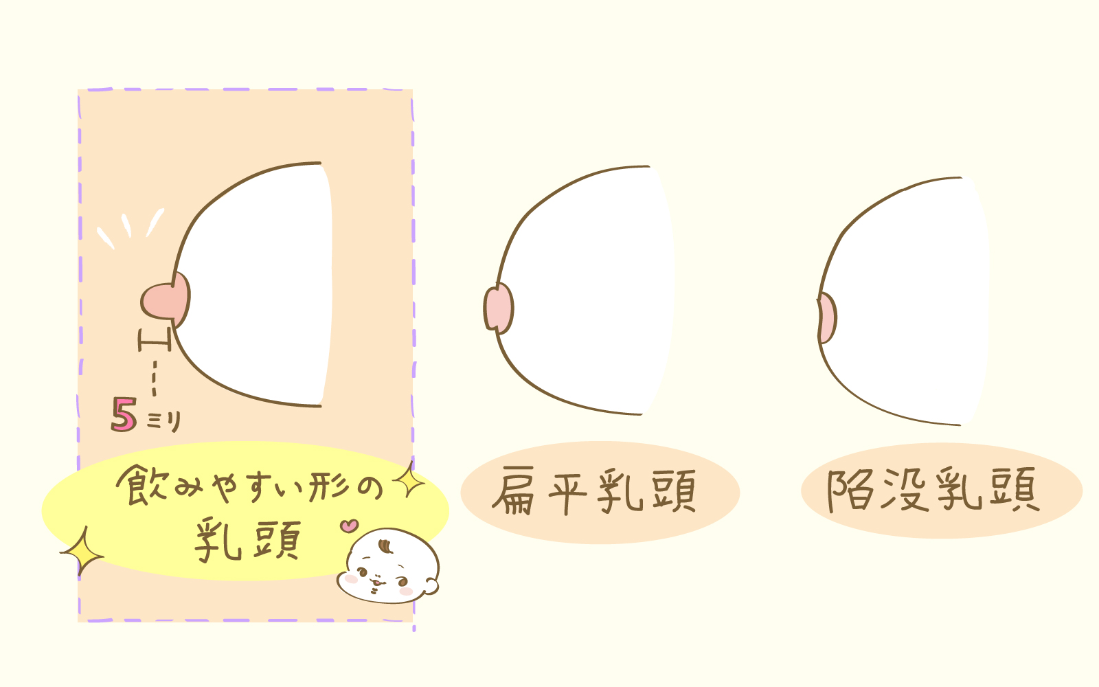 平らな乳首や、乳輪からの高さが5mm以下でくびれがあまりない形の乳首のことを「扁平乳頭」と言います。口に含ませることが難しいので、赤ちゃんがおっぱいを飲みにくいケースが多いようです。