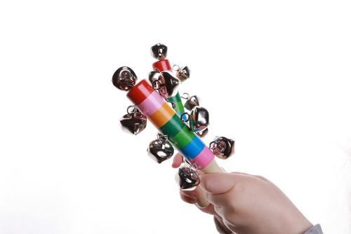 慣らして遊べる鈴は、小さい子どもに人気の高い楽器です。歌や音楽のリズムに合わせて音を出して遊んでみてくださいね。鈴の部分にはペットボトルのキャップなどの廃材を使っても良いですし、100均や手芸店で鈴を購入してアレンジしても良さそうですね。
