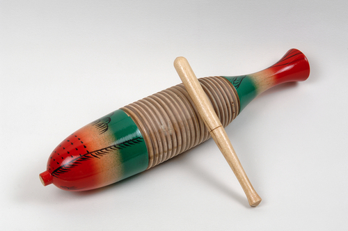ギロは、ひょうたんの中身をくりぬいて外側にいくつもの溝を刻み、棒でこすって演奏する楽器です。ギザギザの部分を棒でこすると、ギコギコとした音がします。